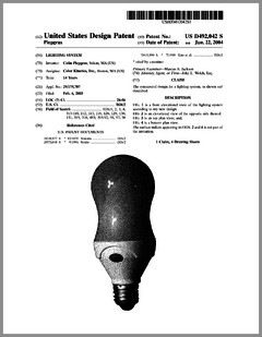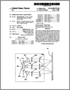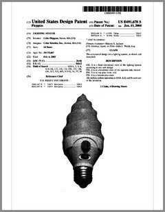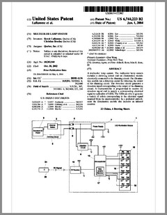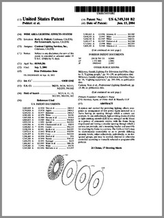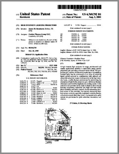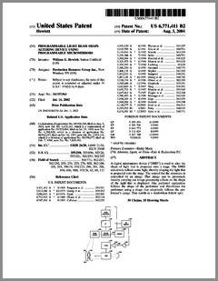 6769792 | High Intensity Lighting Projectors | US | Bornhorst | Genlyte Thomas | 08-03-2004 | 6771411 | Programmable Light Beam Shape Altering Device Using Programmable Micromirrors | US | Hewlett | Production Resource Group | 08-03-2004 | 6769773 | Projector with UV Light Source | US | Wu | | 08-03-2004 | 6764051 | Moving Yoke | US | Knight | | 07-20-2004 | 6764198 | Rotatably Adjustable Reflective Mechanism for a Stage Lamp | US | Chang | | 07-20-2004 | 6765544 | Image Projection Apparatus and Method with Viewing Surface Dependent Image Correction | US | Wynne Willson | WWG | 07-20-2004 | 6761470 | Controller Panel and System for Light and Serially Networked Lighting System | US | Sid | Lowel-Light Manufacturing | 07-13-2004 | D492436 | Light Fixture | US | Smith, Nash, Villareal | | 06-29-2004 | D492042 | Lighting System | US | Piepgrass | Color Kinetics | 06-22-2004 | D491678 | Lighting System | US | Piepgrass | Color Kinetics | 06-15-2004 | 6751027 | Projector With Sealed Inner Compartment | US | Van Den Bossche, Vandorpe, Maes | Barco | 06-15-2004 | 6749310 | Wide Area Lighting Effects System | US | Pohlert, Grosswendt | Contrast Lighting Services | 06-15-2004 | 6744693 | Lighting Fixture | US | Brockmann, Plesner, Poulsen | N.V.ADB TTV Technologies SA | 06-01-2004 | 6744223 | Multicolor Lamp System | US | Laflamme, Brochu | Quebec, Inc | 06-01-2004 | 6736528 | Electronically Controlled Stage Lighting System | US | Hewlett, Clarke, Evans, Parker, Hunt, Hughes | Light & Sound Design | 05-18-2004 | 6737814 | Enhanced Trim Resolution Voltage-Controlled Dimming LED Driver | US | Guthrie, Coley | Aerospace Optics | 05-18-2004 | 6736514 | Imaging Apparatus for Increased Color Gamut Using Dual Spatial Light Modulators | US | Horvath, Roddy, Zolla | Eastman Kodak | 05-18-2004 | 6736527 | Method for Cooling an Arc Lamp | US | Gibbon, Toporkiewicz | Imax | 05-18-2004 | 6737809 | Plasma Lamp With Dielectric Waveguide | US | Espiau, Joshi, Chang | Luxim | 05-18-2004 | 6734637 | Hot-Restrike Ignition System for a High-Frequency High-Intensity Discharge Lamp Assembly | US | Ellams | Power Gems | 05-11-2004 |