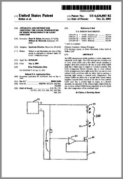 6636003 | Apparatus and Method for Adjusting the Color Temperature of White Semiconductor Light Emitters | US | Rahm, McGrath | Color Kinetics | 10-21-2003 |