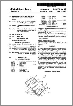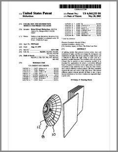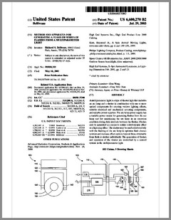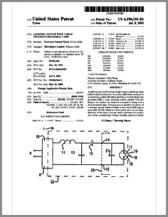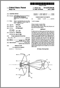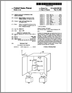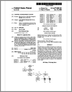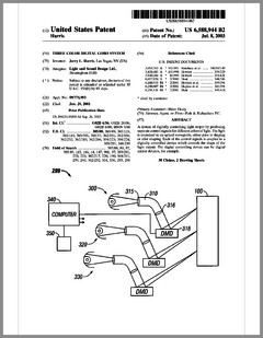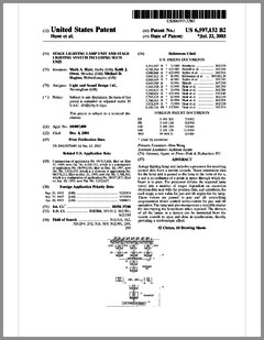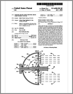 6603276 | Dimming Control System with Distributed Command Processing | US | Chansky, Vannice, Le Vasseur | Leviton | 08-05-2003 | 6600270 | Method and Apparatus for Generating a Flash or Series of Flashes from a Multiparameter Light | US | Belliveau | | 07-29-2003 | D477885 | Lamp | US | Esakoff | Electronic Theatre Controls | 07-29-2003 | 6597132 | Stage Lighting Lamp Unit and Stage Lighting System Including Such Unit | US | Hunt, Owen, Hughes | Light & Sound Design | 07-22-2003 | 6592480 | Belt Looping | US | Evans | Light & Sound Design | 07-15-2003 | 6592238 | Illumination Device For Simulation of Neon Lighting | US | Cleaver, Eriksson, Hulse | Light Technologies | 07-15-2003 | 6590350 | Lighting System Witha High Intensity Discharge Lamp | US | Tyson | MicroLights | 07-08-2003 | 6588944 | Three Color Digital Gobo System | US | Harris | Light & Sound Design | 07-08-2003 | 6588912 | Foldable Modular Light Diffusion Box | US | Finn | | 07-08-2003 | 6585395 | Variable Beam Light Emitting Diode Light Source System | US | Luk | Altman Stage Lighting | 07-01-2003 | 6578991 | Bulb Cooling | US | Beaumont | Light & Sound Design | 06-17-2003 | 6578986 | Modular Mounting Arrangement and Method For Light Emitting Diodes | US | Swaris, Van Ness | Permlight | 06-17-2003 | 6577080 | Lighting Entertainment System | US | Lys, Mueller | Color Kinetics | 06-10-2003 | 6575577 | Multiple Light Valve Lighting Device or Apparatus with Wide Color Palette and Improved Contrast Ratio | US | Belliveau | | 06-10-2003 | 6572246 | Lighting Device | US | Hopp, Bertelmann | | 06-03-2003 | 6570348 | Apparatus for Digital Communications with Multiparameter Light Fixtures | US | Belliveau | | 05-27-2003 | 6565233 | Color, Size and Distribution Module for Projected Light | US | Richardson | | 05-20-2003 | 6565941 | Medium for a Color Changer | US | Hewlett | Light & Sound Design | 05-20-2003 | 6561653 | Multiple Light Valve Lighting Device or Apparatus with Wide Color Palette and Improved Contrast Ratio | US | Belliveau | | 05-13-2003 | 6563520 | Virtual Reality Interface for Show Control | US | Parker, Hewlett | Light & Sound Design | 05-13-2003 |