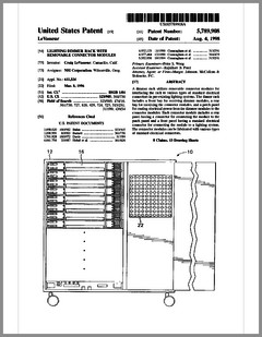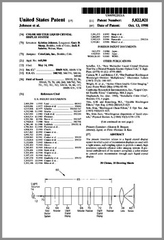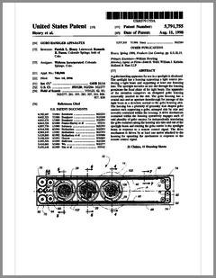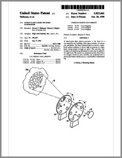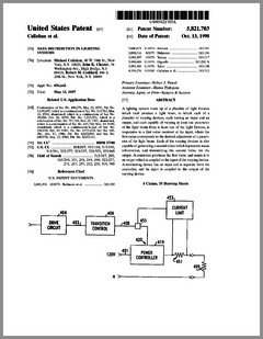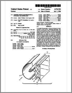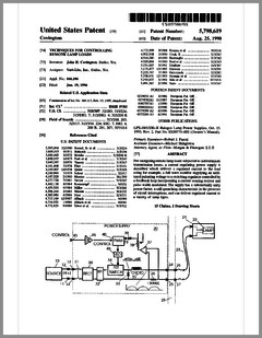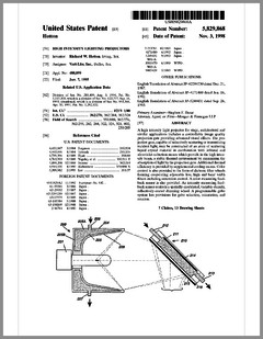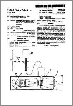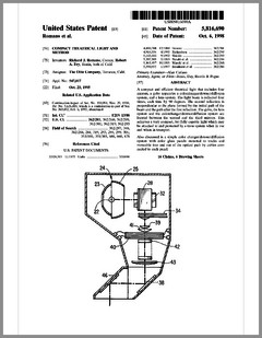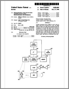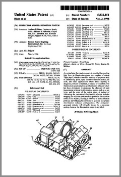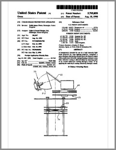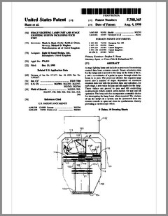 5882107 | Compact Luminaire System | US | Bornhorst, Hanson, Huggins, Stacy | Vari-Lite | 03-16-1999 | 5873650 | Modular Heat Sink Adapter for Lamp Bases | US | Luk, Kliegl | | 02-23-1999 | 5829868 | High Intensity Lighting Projectors | US | Hutton | Vari-Lite | 11-03-1998 | 5832151 | Reflector and Illumination System | US | Riser, Albrecht, Liu, To | Remote Source Lighting International | 11-03-1998 | 5828485 | Programmable Light Beam Shape Altering Device Using Programmable Micromirrors | US | Hewlett | Light & Sound Design | 10-27-1998 | 5823661 | Fused Glass Light Pattern Generator | US | Mahanay, Ziegler | High End Systems | 10-20-1998 | 5825548 | Cross-Fading Color Filter and System | US | Bornhorst, Hutton | Vari-Lite | 10-20-1998 | 5821703 | Data Distribution in Lighting Systems | US | Callahan, Chester, Goddard | | 10-13-1998 | 5822021 | Color Shutter Liquid Crystal Display System | US | Johnson, Sharp, Salerno | ColorLink | 10-13-1998 | 5816690 | Compact Theatrical Light and Method | US | Romano, Fry | Obie | 10-06-1998 | 5812596 | Repeater for use in a Control Network | US | Hunt, Murray | Light & Sound Design | 09-22-1998 | 5806951 | Multi-Substrate Gobo | US | Roman, Kittrell | High End Systems | 09-15-1998 | 5798619 | Techniques for Controlling Remote Lamp Loads | US | Covington | Vari-Lite | 08-25-1998 | 5794881 | Gel Tensioning Device | US | Evans | Light & Sound Design | 08-18-1998 | 5795058 | Color Image Protection Apparatus | US | Owen | Light & Sound Design | 08-18-1998 | 5791755 | Gobo Handler Apparatus | US | Henry, Fasen | Wybron | 08-11-1998 | 5788365 | Stage Lighting Lamp Unit and Stage Lighting System Including Such Unit | US | Hunt, Owen, Hughes | Light & Sound Design | 08-04-1998 | 5789908 | Lighting Dimmer Rack with Removable Connector Modules | US | LeVasseur | NSI | 08-04-1998 | 5790329 | Color Changing Device for Illumination Purposes | US | Klaus, Oliver | | 08-04-1998 | 5775799 | Lighting Device Incorporating a Zoomable Beamspreader | US | Forkner | Cunningham | 07-07-1998 |
