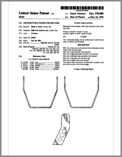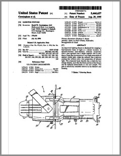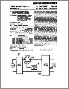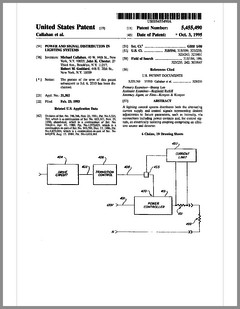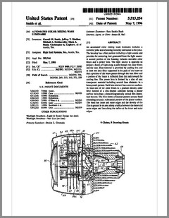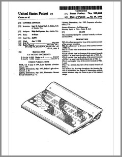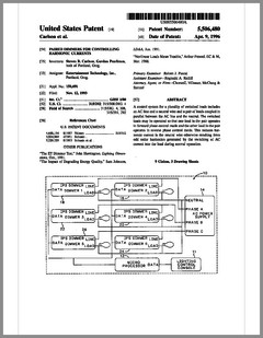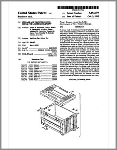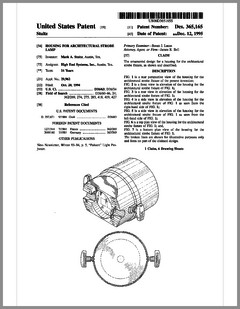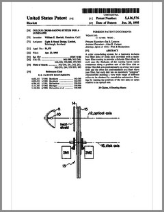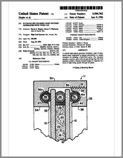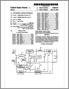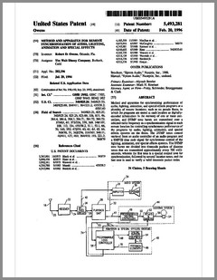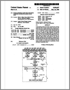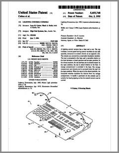 D370080 | Architectural Strobe Fixture Yoke | US | Stultz | High End Systems | 05-21-1996 | 5515254 | Automated Color Mixing Wash Luminaire | US | Smith, Maddox, Dubinovsky, Stultz, Cogburn | High End Systems | 05-07-1996 | 5506762 | Fluid Filled Colored Light Pattern Generator with Twist Cap | US | Ziegler, Mahanay | High End Systems | 04-09-1996 | 5506480 | Paired Dimmers for Controlling Harmonic Currents | US | Carlson, Pearlman | Entertainment Technology | 04-09-1996 | 5504477 | Tracking System | US | Whitright, Newman, Fasen | Wybron | 04-02-1996 | 5502627 | Stage Lighting Lamp Unit and Stage Lighting System Including Such Unit | US | Hunt, Owen, Hughes | Light & Sound Design | 03-26-1996 | 5500575 | Switchmode AC Power Controller | US | Ionescu | Lighting Control Inc | 03-19-1996 | 5493281 | Method and Apparatus for Remote Synchronization of Audio, Lighting, Animation and Special Effects | US | Owens | Walt Disney Company | 02-20-1996 | D366712 | Adjustable Spot Luminaire | US | Hanson, Stacy, Terleski | Vari-Lite | 01-30-1996 | D365165 | Housing for Architectural Strobe Lamp | US | Stultz | High End Systems | 12-12-1995 | 5455748 | Lighting Control Console | US | Cotten, Stultz | High End Systems | 10-03-1995 | 5454477 | Storage and Transportation Trunk for Lighting Equipment | US | Bornhorst, Dangerfield, Maddux, Stacy, Terleski | Vari-Lite | 10-03-1995 | 5455490 | Power and Signal Distribution in Lighting Systems | US | Callahan, Chester, Goddard | | 10-03-1995 | 5446637 | Lighting Fixture | US | Cunningham, Esakoff | | 08-29-1995 | D360404 | Control Console | US | Cotten | High End Systems | 07-18-1995 | 5432691 | Automated Truss Module with Deployment Mechanism | US | Garrett, Ellis | Vari-Lite | 07-11-1995 | 5430629 | Fluid Filled Colored Light Pattern Generator with Twist Cap | US | Belliveau, Mahanay | High End Systems | 07-04-1995 | D359574 | Adjustable Lamp | US | Bornhorst, Stacy, Terleski | Vari-Lite | 06-20-1995 | 5426576 | Colour Cross-Fading System for a Luminaire | US | Hewlett | Light & Sound Design | 06-20-1995 | 5424618 | Arrangements for Reducing Interference from a Dimming System, and Dimmer Therefor | US | Bertenshaw, Brown | Strand Lighting | 06-13-1995 |