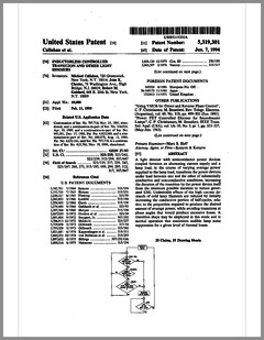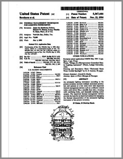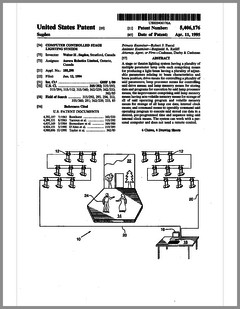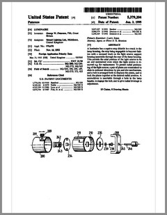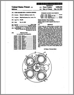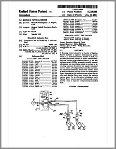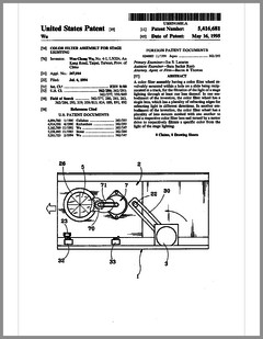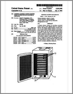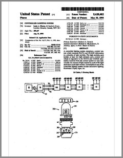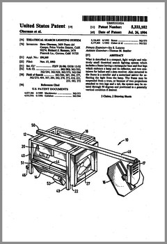 5420482 | Controlled Lighting System | US | Phares | | 05-30-1995 | 5416681 | Color Filter Assembly for Stage Lighting | US | Wen-Chong | | 05-16-1995 | 5414328 | Stage Lighting Control Console Including Assignable Macro Functions | US | Hunt, Owen | Light & Sound Design | 05-09-1995 | 5406176 | Computer Controlled Stage Lighting System | US | Sugden | Aurora Robotics | 04-11-1995 | 5402326 | Gobo Holder for a Lighting System | US | Belliveau | High End Systems | 03-28-1995 | 5390463 | Modular Truss Structure | US | Sollner | Penn Fabrication | 02-21-1995 | 5379204 | Luminaire | US | Paterson | Strand Lighting | 01-03-1995 | 5367444 | Thermal Management Techniques for Lighting Instruments | US | Bornhorst, Hutton, Stacy | Vari-Lite | 11-22-1994 | 5365148 | Sinusoidal Inductorless Dimmer Providing an Amplitude Attenuated Output | US | Mallon, Bateman | Electronics Diversified | 11-15-1994 | 5352958 | Lighting Control System Dimmer Module with Plug-In Electrical Contacts | US | Cunningham, Esakoff | | 10-04-1994 | D350408 | Exterior Architectural Luminaire | US | Leigh, Planka | Vari-Lite | 09-06-1994 | 5345371 | Lighting Fixture | US | Cunningham, Esakoff | | 09-06-1994 | 5335468 | Compact Truss System | US | Oberman, Teuber | | 08-09-1994 | 5331822 | Device for Cooling Chemical Smoke | US | Belliveau, Maddox | High End Systems | 07-26-1994 | 5333102 | Theatrical Search Lighting System | US | Oberman, Ramano | | 07-26-1994 | 5331359 | Method for Creating and Storing a Theatrical Design and Apparatus for Implementing Same | US | Leclercq | | 07-19-1994 | 5325473 | Apparatus and Method for Projection Upon a Three-Dimensional Object | US | Monroe, Redmann | Walt Disney Company | 06-28-1994 | 5323088 | Dimming Control Circuit | US | Cunningham | Esakoff | 06-21-1994 | 5319301 | Inductorless Controlled Transition and Other Light Dimmers | US | Callahan, Chester, Goddard | | 06-07-1994 | D347113 | Storage and Transportation Trunk | US | Bornhorst, Dangerfield, Maddux, Stacy, Terleski | Vari-Lite | 05-24-1994 |
