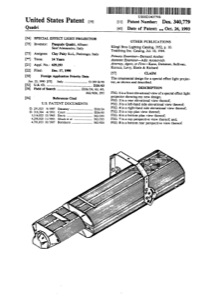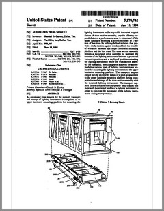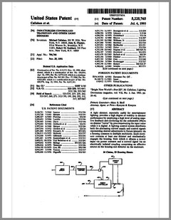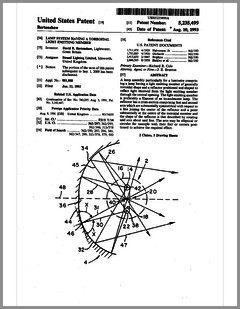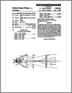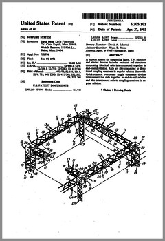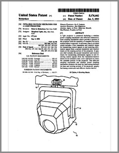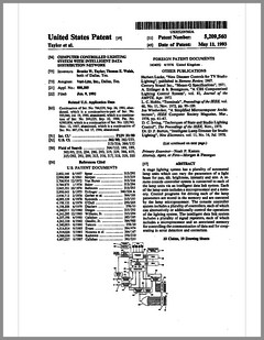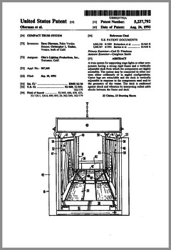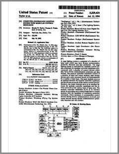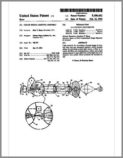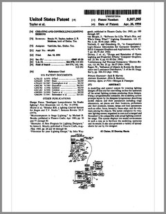 5307295 | Creating and Controlling Lighting Designs | US | Taylor, Meldrum | Vari-Lite | 04-26-1994 | 5282121 | High Intensity Lighting Projectors | US | Bornhorst, Stacy, Hutton | Vari-Lite | 01-25-1994 | 5329431 | Computer Controlled Lighting System with Modular Control Resources | US | Taylor, Walsh | Vari-Lite | 01-12-1994 | 5278742 | Automated Truss Module | US | Garrett | Vari-Lite | 01-11-1994 | 5268631 | Power Control System with Improved Phase Control | US | Gorman, Warren | Chicago Stage Equipment | 12-07-1993 | 5268613 | Incandescent Illumination System | US | Cunningham | Esakoff | 12-07-1993 | 5261833 | Lamp Base Assembly | US | Pujol | Altman Stage Lighting | 11-16-1993 | D340779 | Special Effect Light Projector | US | Quadri | Clay Paky | 10-26-1993 | 5249111 | Reflector for Use with Spotlight | US | Richardson | Morpheus Lights | 09-28-1993 | 5237792 | Compact Truss System | US | Oberman, Teuber | Obie | 08-24-1993 | 5237244 | Electric Lighting and Power Controllers Therefor | US | Bertenshaw, Williamson, Wright | Strand Lighting | 08-17-1993 | 5235499 | Lamp System Having a Torroidal Light Emitting Member | US | Bertenshaw | Strand Lighting | 08-10-1993 | 5225765 | Inductorless Controlled Transition and Other Light Dimmers | US | Callahan, Chester, Goddard | | 07-06-1993 | 5217832 | Permanent Color Transparencies on Single Substrates and Methods for Making the Same | US | Joslin, Nelson | Walt Disney Company | 06-08-1993 | 5209560 | Computer Controlled Lighting System with Intelligent Data Distrubution Network | US | Taylor, Walsh | Vari-Lite | 05-11-1993 | 5205101 | Support System | US | Swan, Emerson | | 04-27-1993 | 5198939 | Apparatus for Positioning Apertures of a Disk Assembly | US | Hewett | Altman Stage Lighting | 03-30-1993 | 5188452 | Color Mixing Light Assembly | US | Ryan | Altman Stage Lighting | 02-23-1993 | 5186536 | Lighting Instrument with Movable Filters and Associated Actuation Mechanism | US | Bornhorst, Stacy | Vari-Lite | 02-16-1993 | 5176442 | Infra-Red Coupling Mechanism for a Light Projector | US | Richardson | Morpheus Lights | 01-05-1993 |