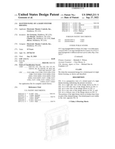 D965211 | Slotted Panel of a Light Fixture Housing | US | Goossens, Rasche, Xu, Zlevor | Electronic Theatre Controls | 09-27-2022 |