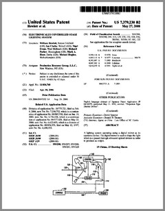 7379230 | Electronically Controlled Stage Lighting System | US | Hewlett, Clarke, Evans, Parker, Hunt, Hughes | Production Resource Group | 05-27-2008 |